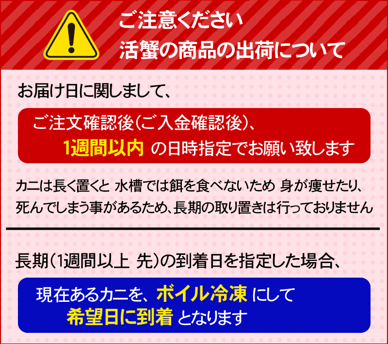 ■長期(1週間以上 先)の到着日を指定した場合、【ボイル冷凍にして、希望日に到着】となります