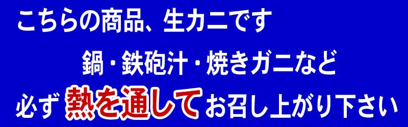 | カニの表面の氷を、流水もしくはぬるま湯でと溶かします。 完全に溶けてしますと、カットしづらくなりますので、半解凍で、調理する大きさに切り分けてください。 生冷凍は、焼きガニやお鍋などで加熱してお召し上がりください。 鍋・焼カニに向いてます。焼き蟹の場合は、アルミホイルで包んで焼くと「ふっくら」仕上がります! |