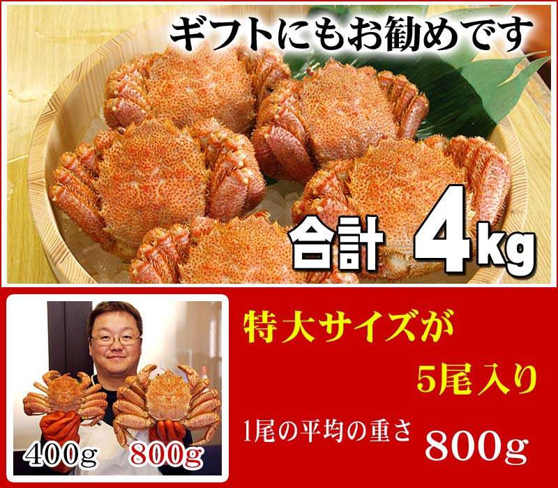 | 毛がに 5尾入りで 合計4kg前後 ボイル冷凍 北海道産 先爪が無いものも含まれる場合もございますので、予めご了承ください ■1尾の平均の重さ 800g ボイル後、鮮度・旨味を急速冷凍し封じ込めました。蟹味噌も美味しい。