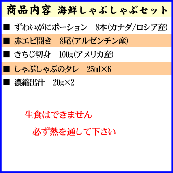 | 豪華な3種類の海鮮しゃぶしゃぶ、ダシ付きでお手軽にしゃぶしゃぶできます。 フワットロの触感のズワイガニ、 甘みが美味しい赤エビ、 脂の乗りが良いキチジ 食べやすいように、全てむき身に加工しております。 鍋に特製だし汁と海鮮具材を入れるだけの簡単調理です。 ※入荷によりパッケージが変わることがあります |